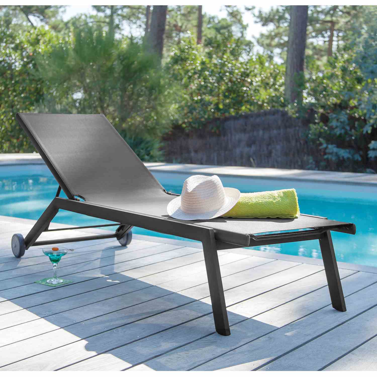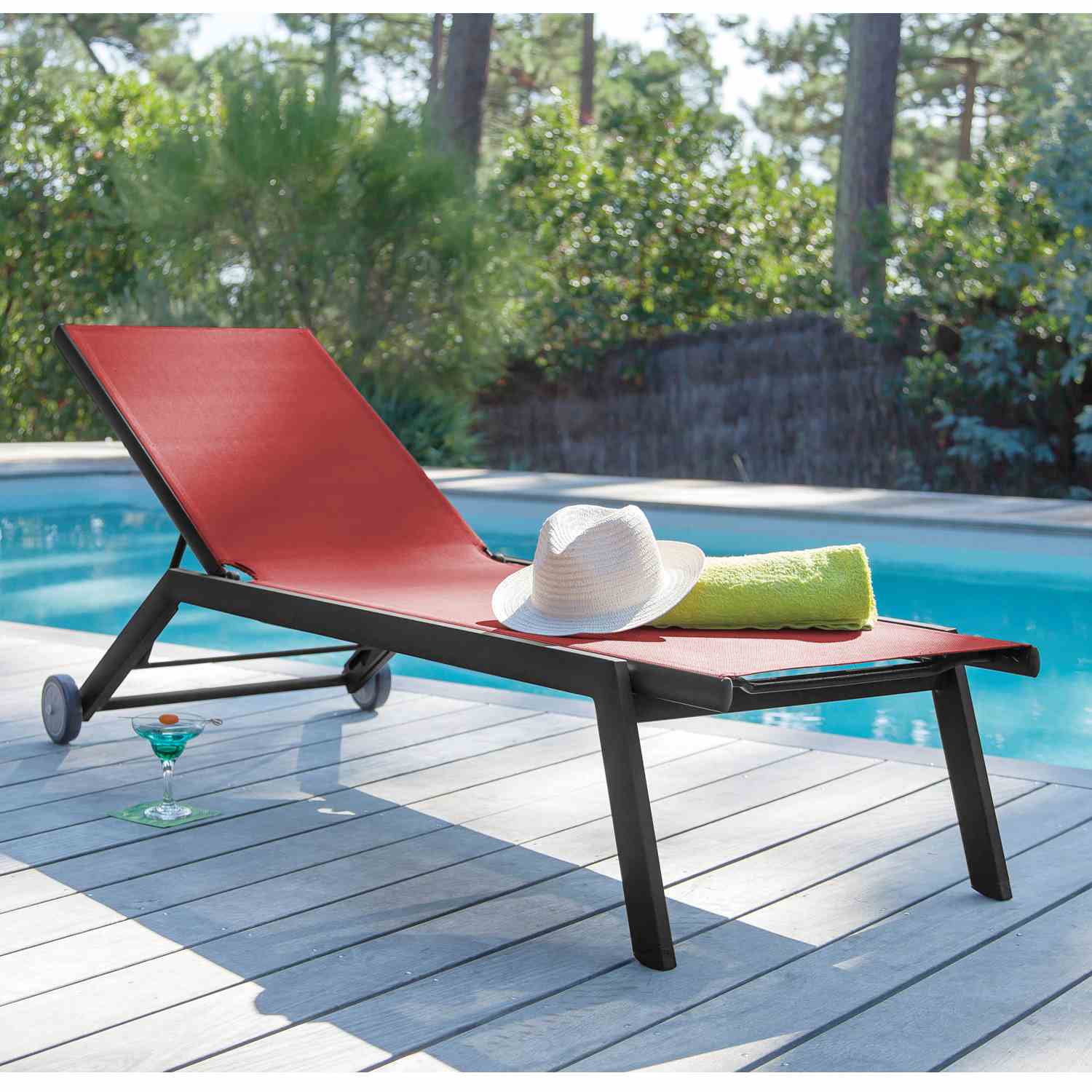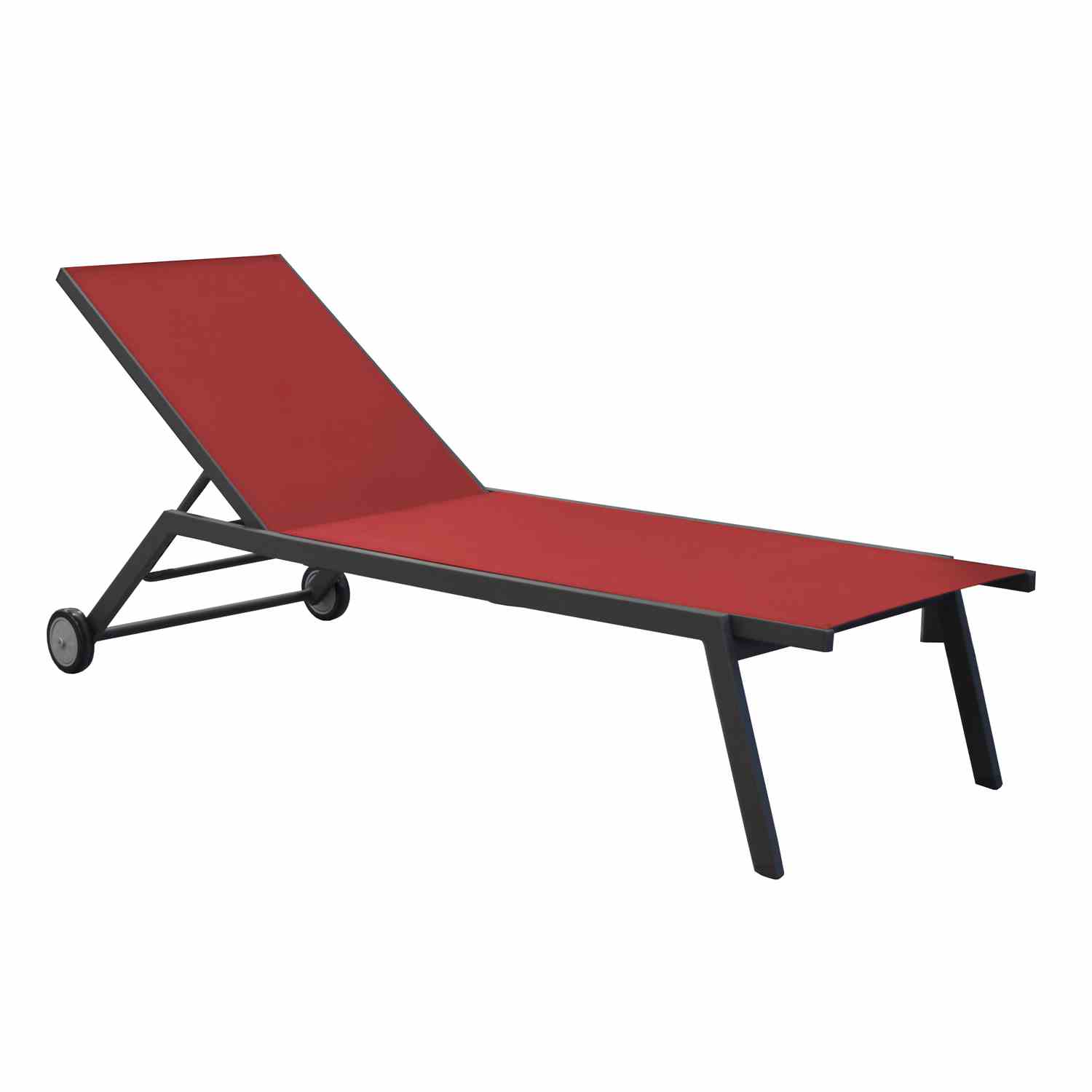 Caractéristiques techniques : structure aluminium, assise toile TPEP (Toile Polyester Enduit Perforée), finition peinture époxy, dossier réglables 5 positions. Roues à monter soi-même.