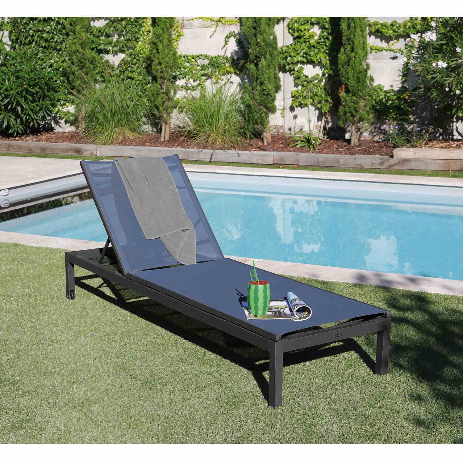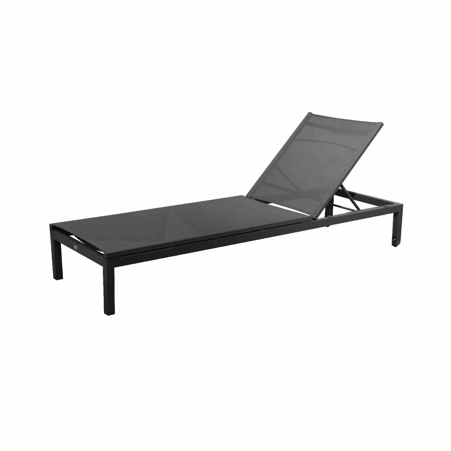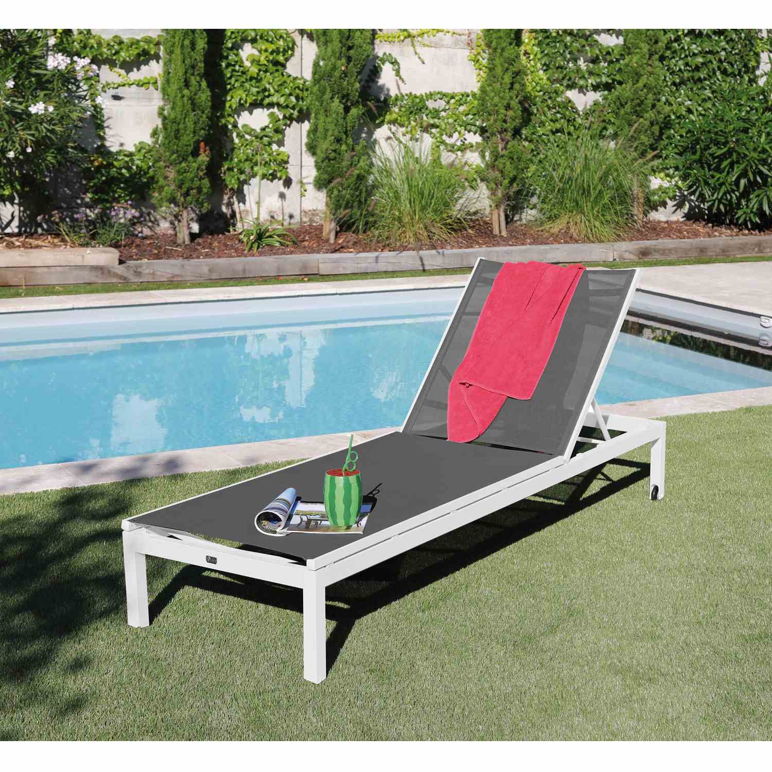 Caractéristiques techniques : structure aluminium, assise toile TPEP (Toile Polyester Enduit Perforée), finition peinture époxy, dossier réglable (4 positions), roues.