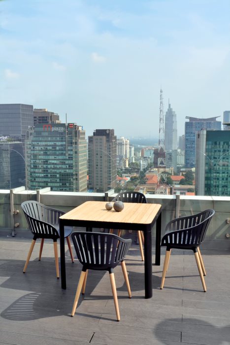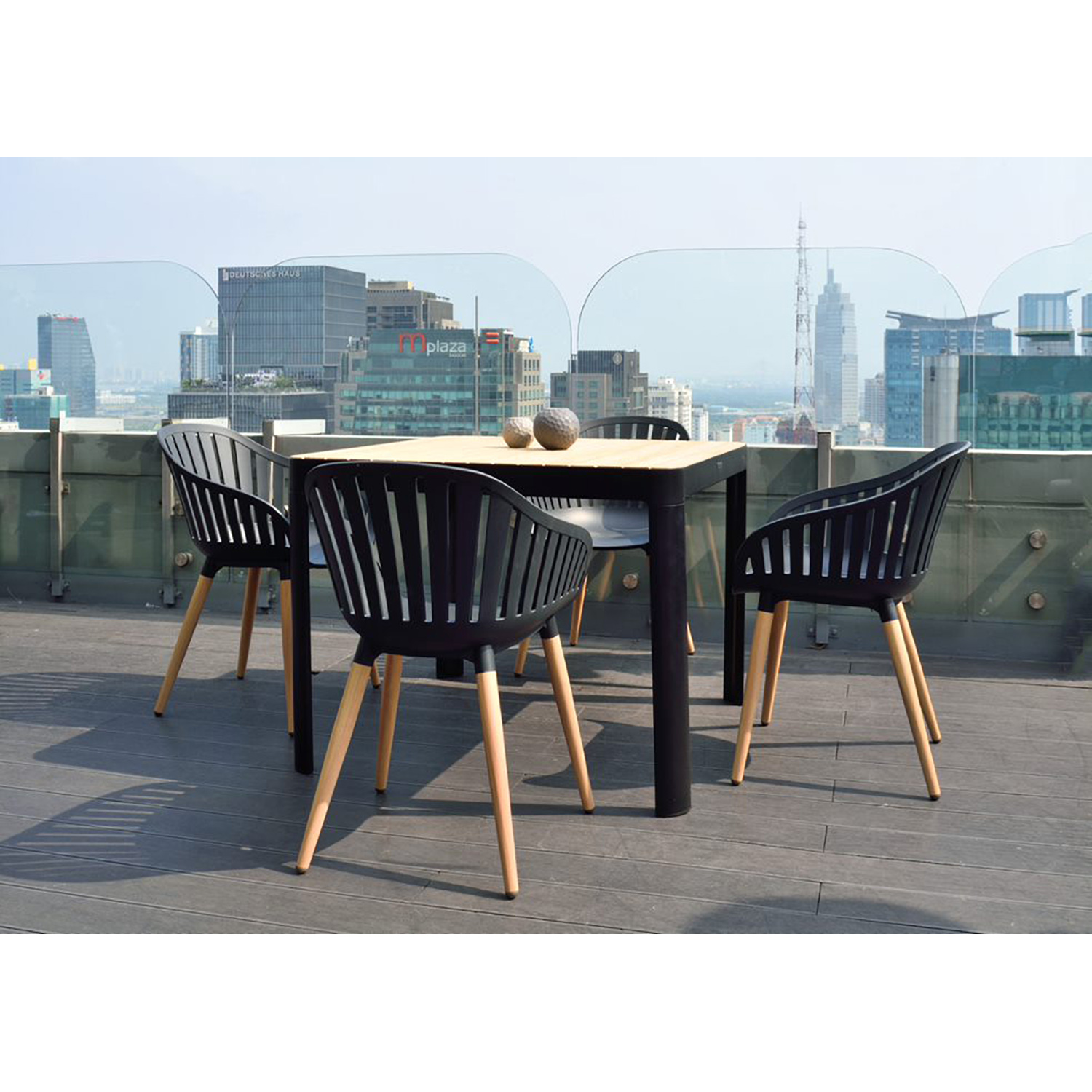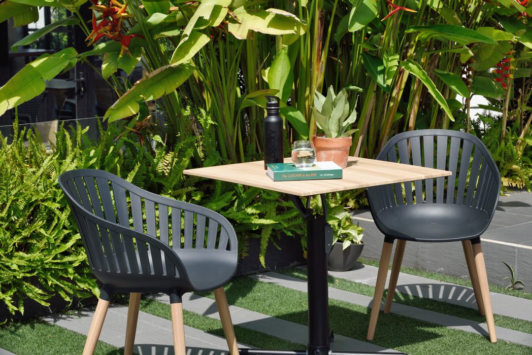 La chaise Portals au design travaillé est extrêmement durable grâce au polypropylène. Résistance aux UV et aux intempéries, ses pieds en aluminium sont traités contre la corrosion.