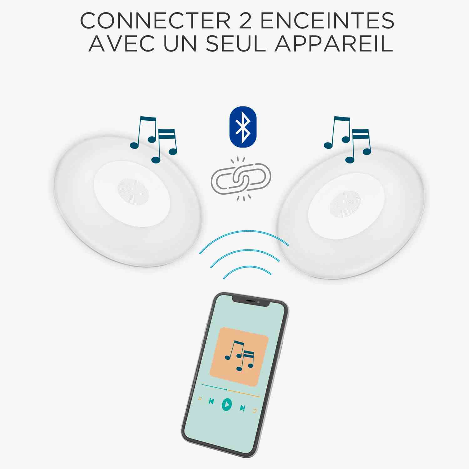Le disque Play 40 est doté de la technologie Bluetooth TWS, ce qui vous permet de connecter deux disques Play 40 avec un seul appareil. Avec sa télécommande (incluse), vous pouvez passer d’une couleur fixe à un autre mode de couleur, jouer ou mettre en pause la lecture…