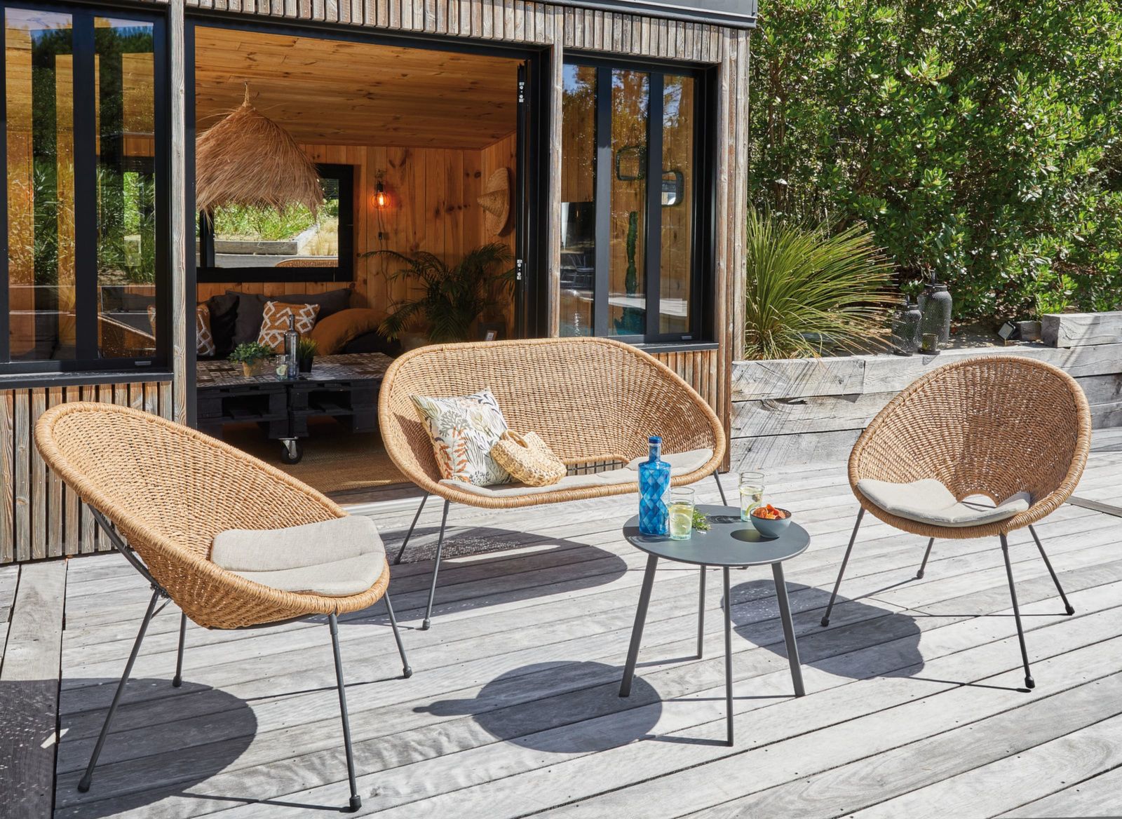 Le fauteuil Tornado nous charme par son assise profonde habillée de résine synthétique tressée
