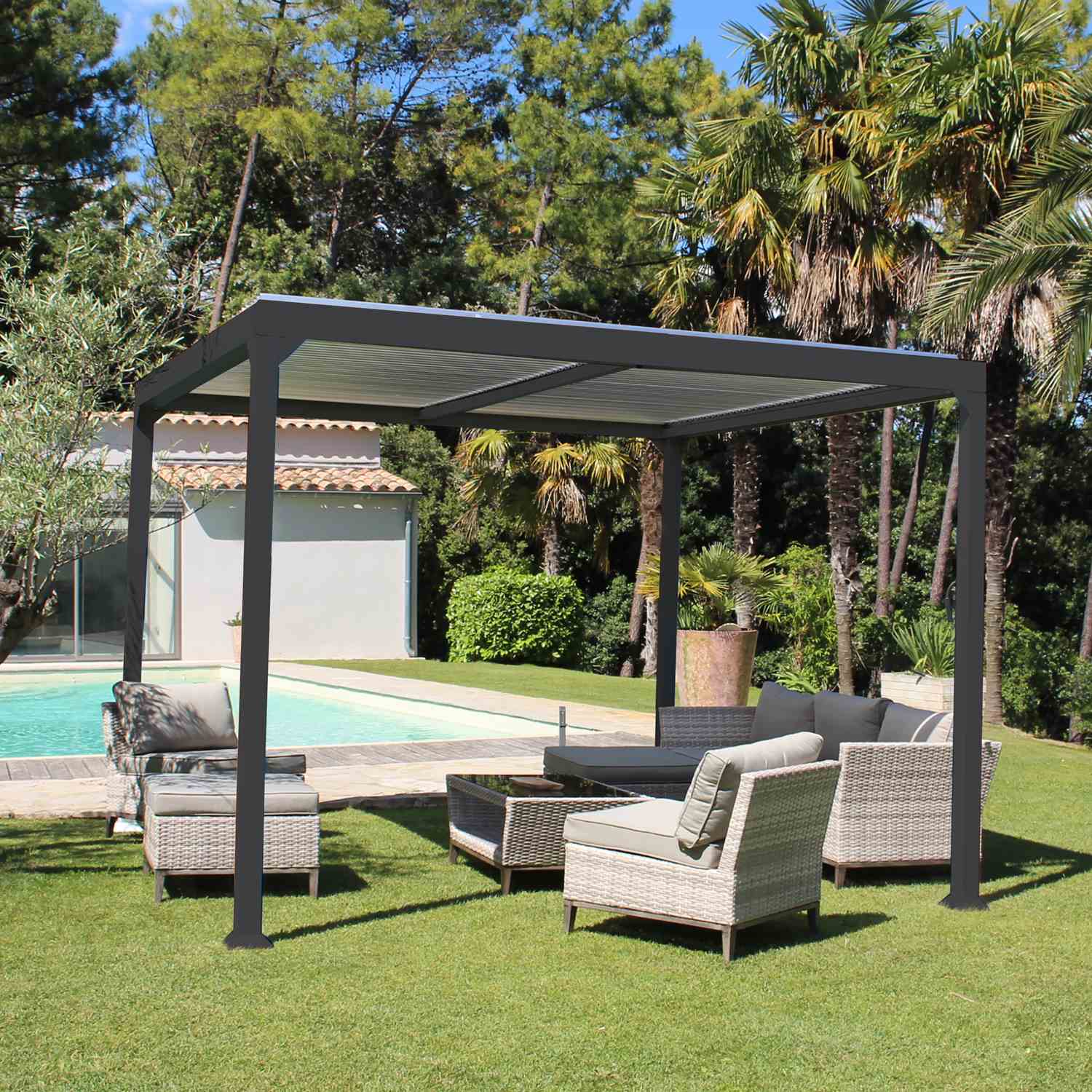 Cette pergola bioclimatique est idéale pour passer la journée dehors tout en restant au frais grâce à ses lames orientables.