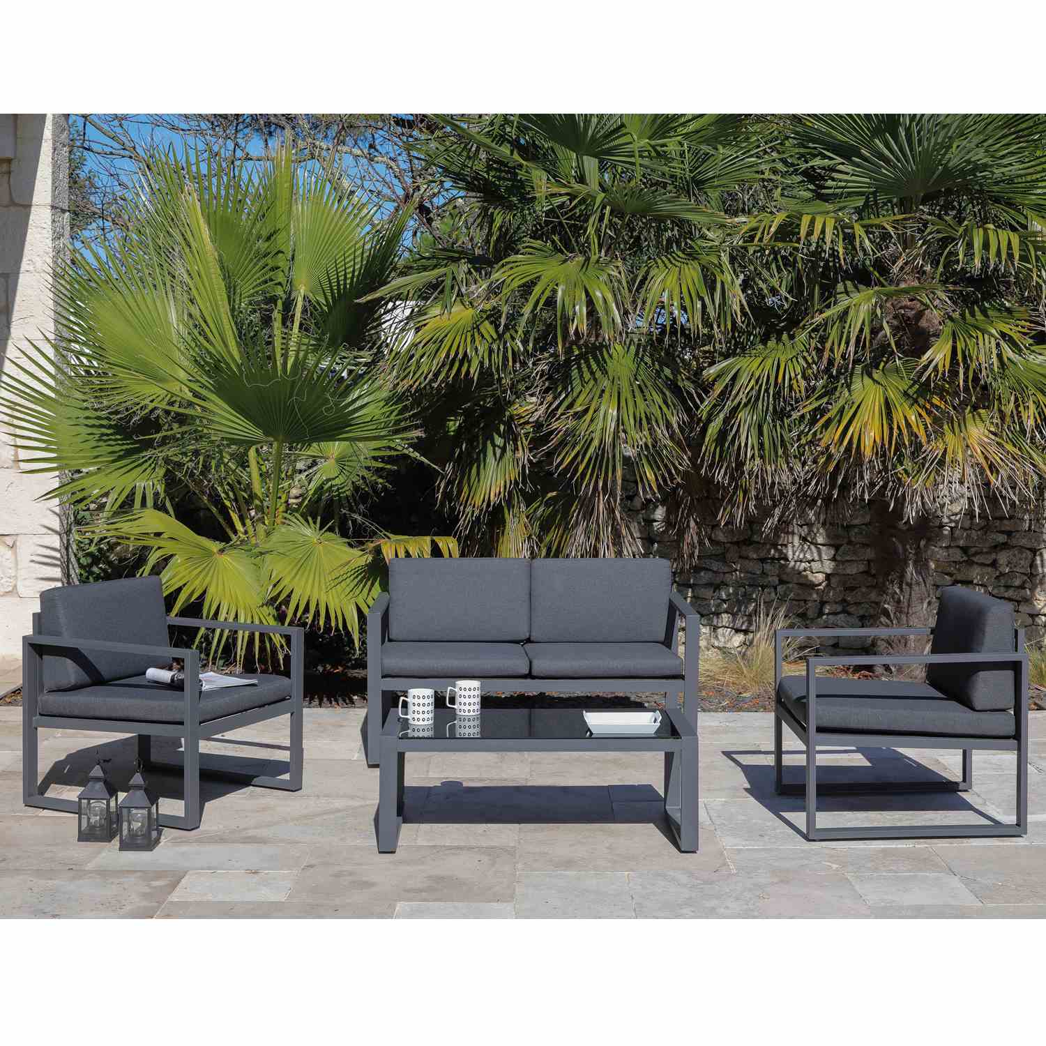 Caractéristiques techniques : structure en aluminium pour une legèreté et une durabilité face aux intempéries et aux uv. Coussins en polyester pour une assise confortable. Coloris : gris.