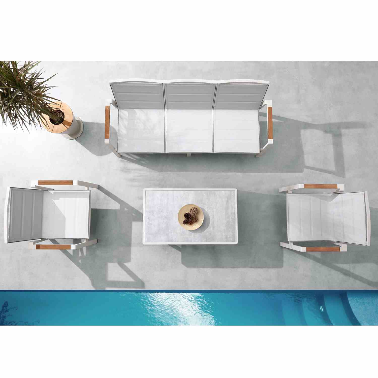 Le salon NOFI 2.0 est idéal en bord de piscine, le design et la combinaison de trois éléments, batyline, aluminium et bois en fond un modèle unique. Le tissu résiste aux intempéries et sèche rapidement.