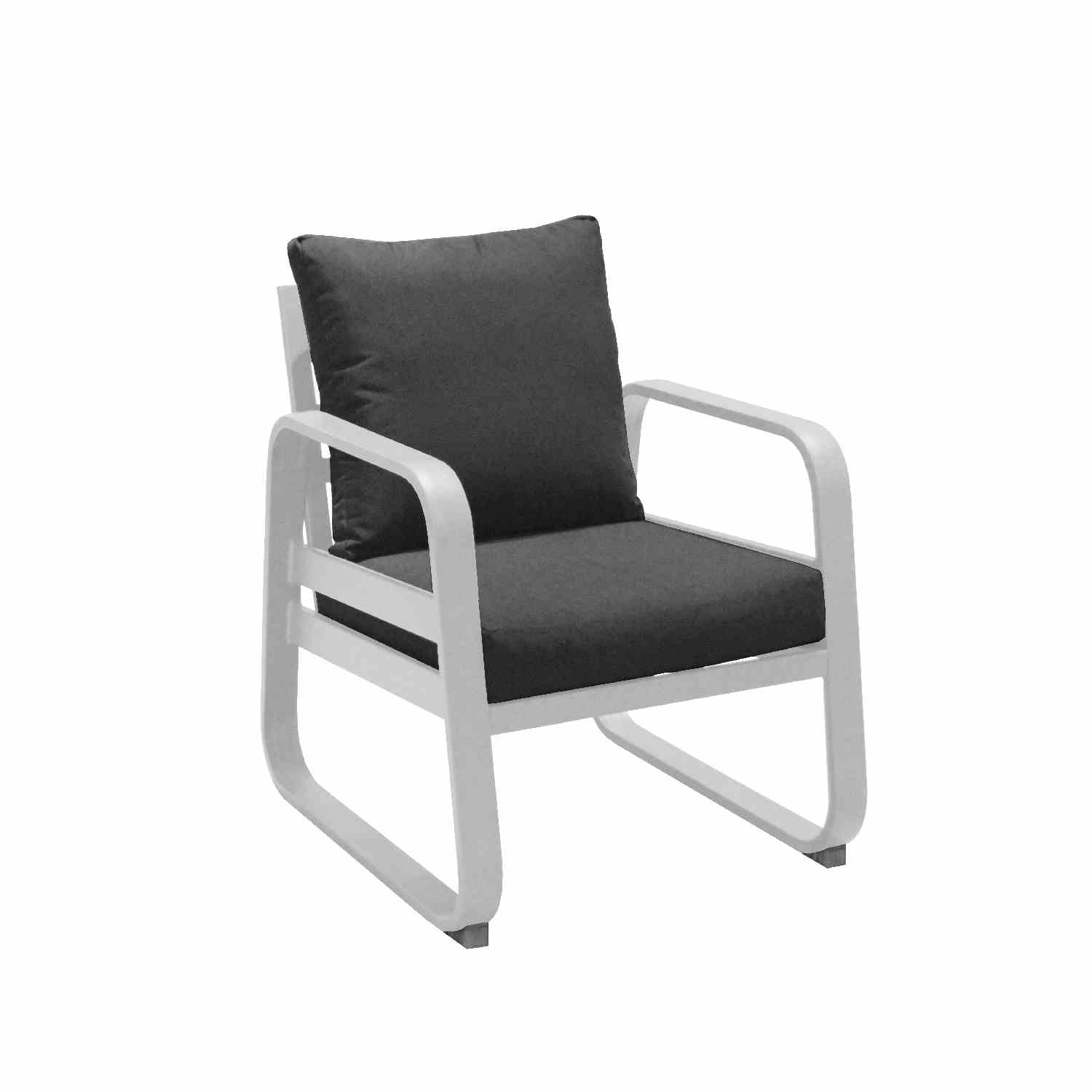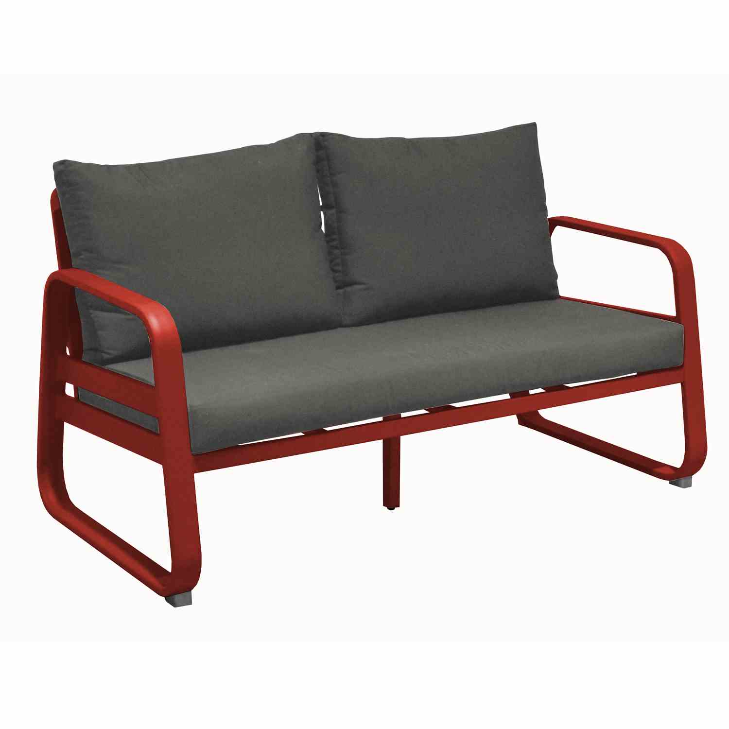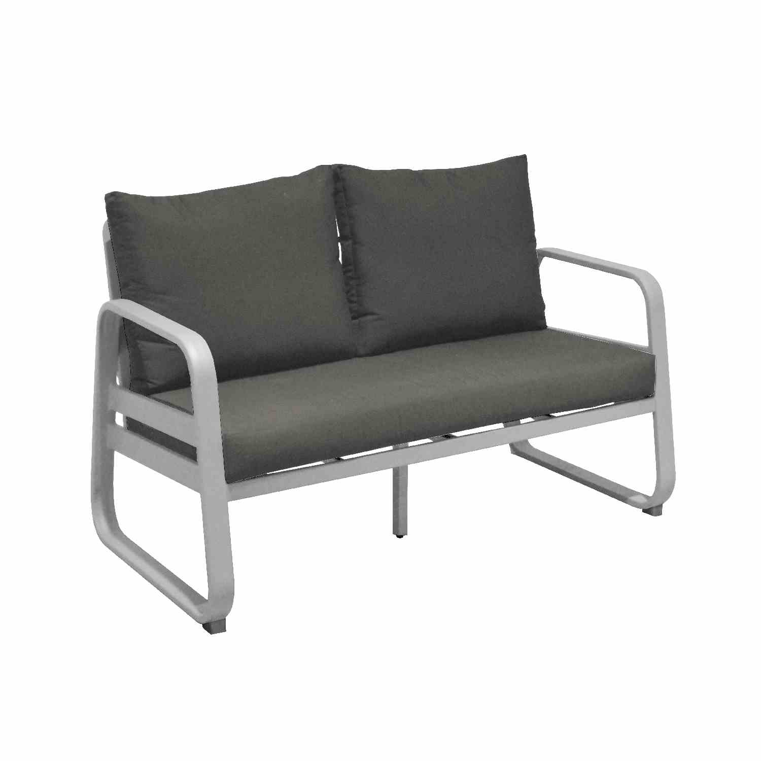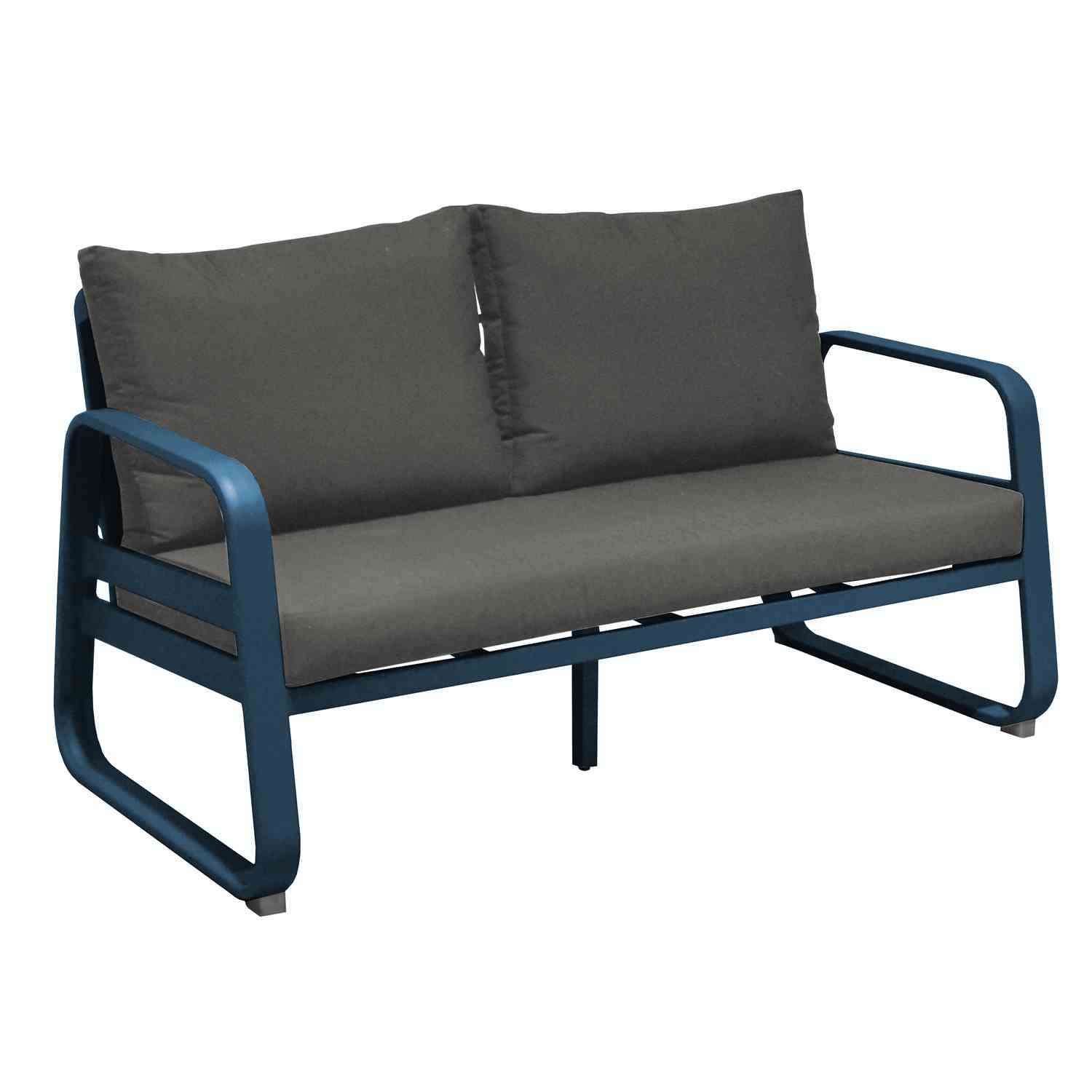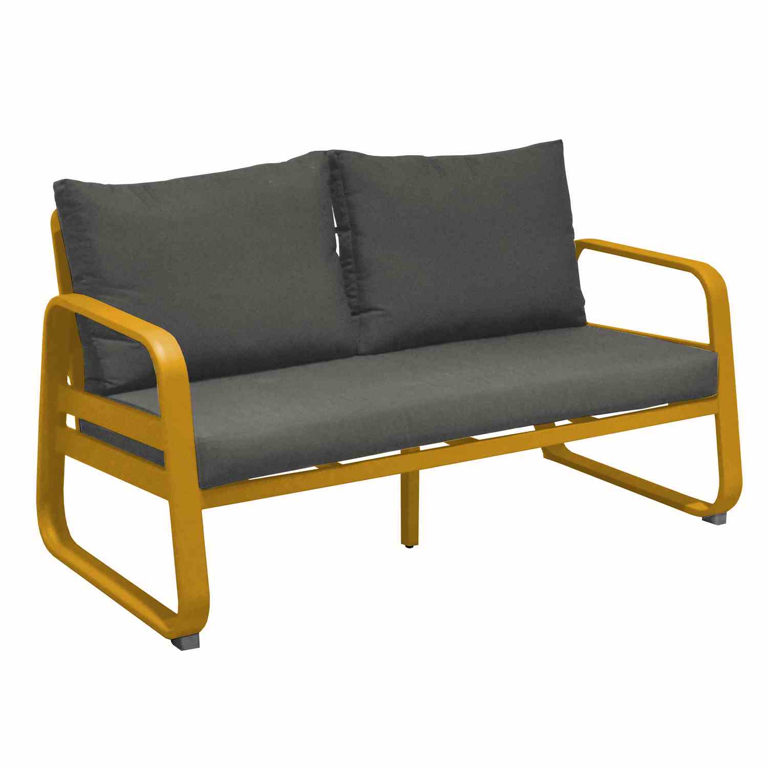 Caractéristiques techniques : Structure en aluminium recouverte d’une peinture époxy. Dimensions : canapé L150xP73,80xH79cm / Fauteuil L69xP73,70xH79cm / Table basse L80xl80xh40cm