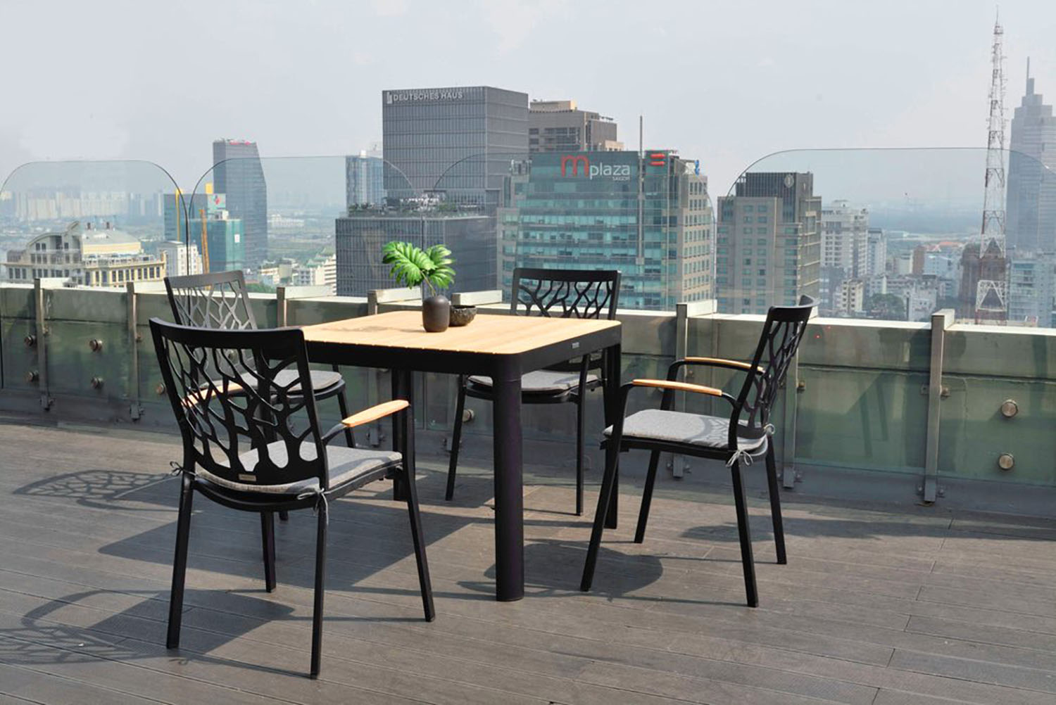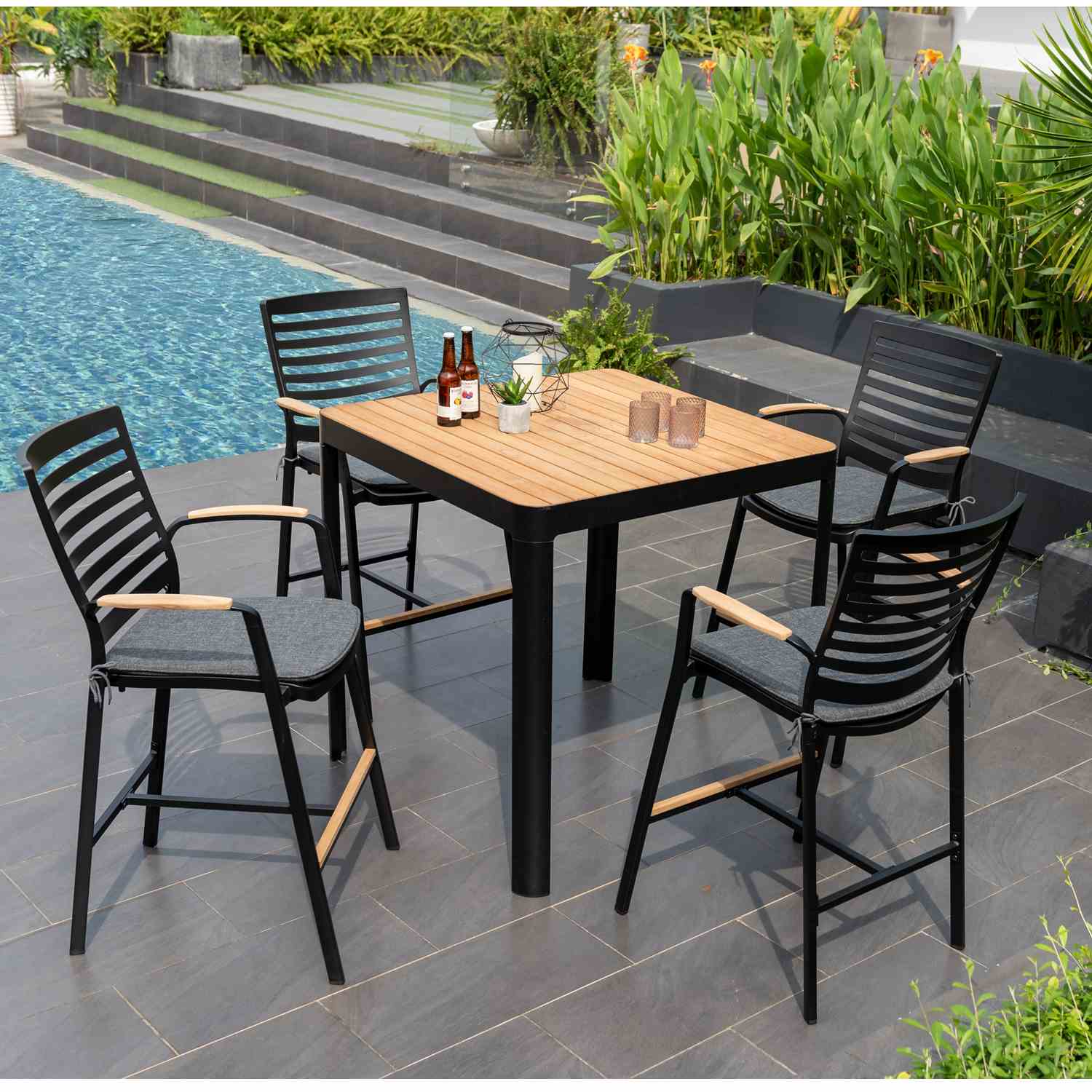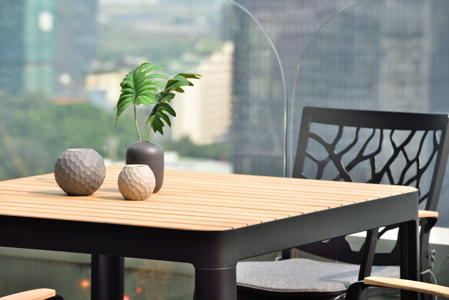 Caractéristiques techniques : structure en aluminium et plateau en teck FSC, peinture de finition, sablée noir.