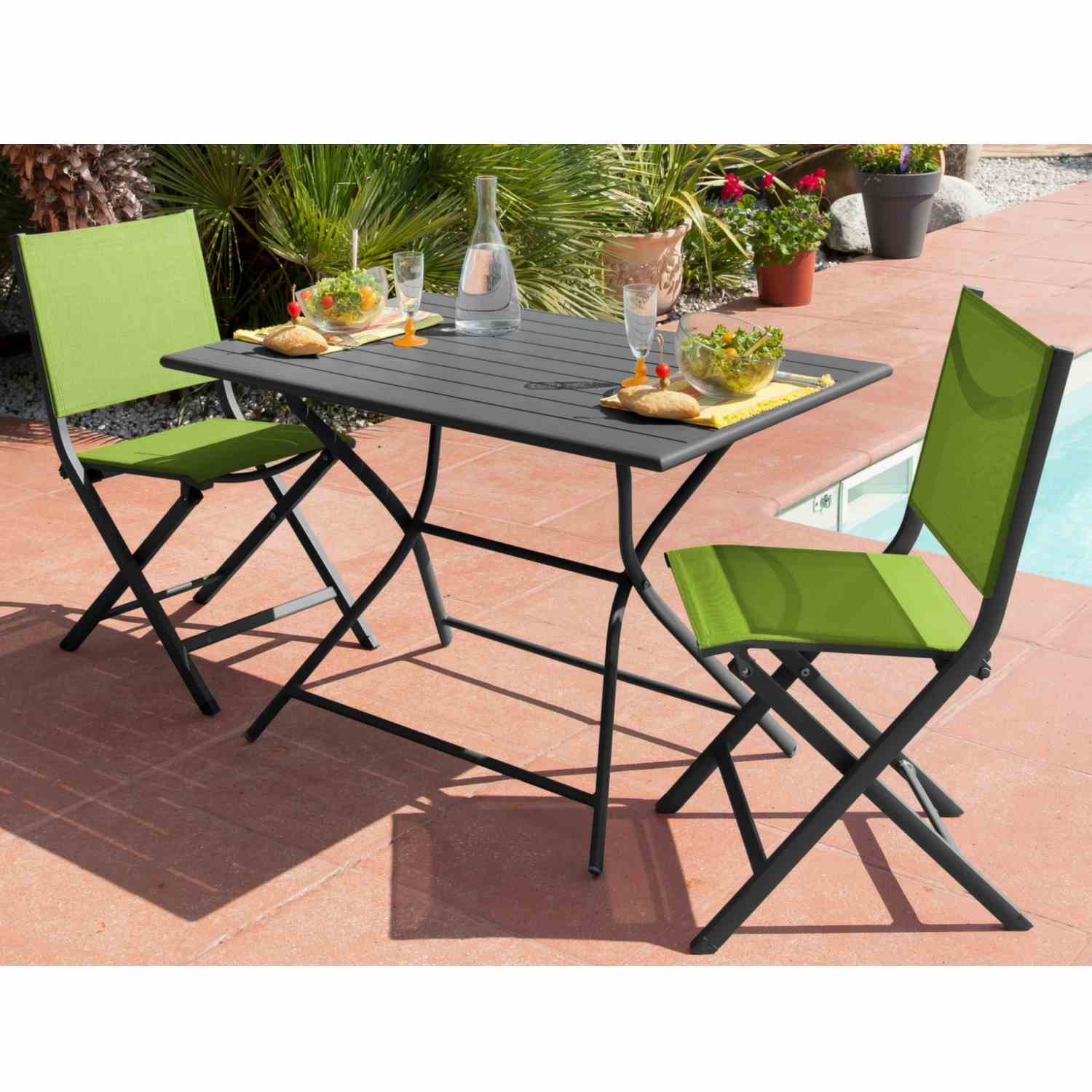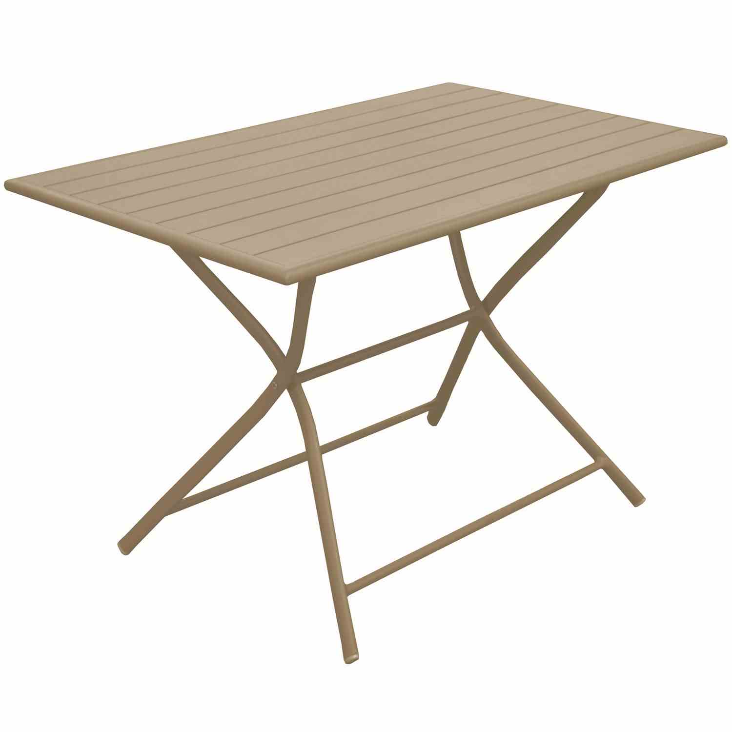 Caractéristiques techniques : table rectangulaire en aluminium. Plateau à lattes, piétement pliant.