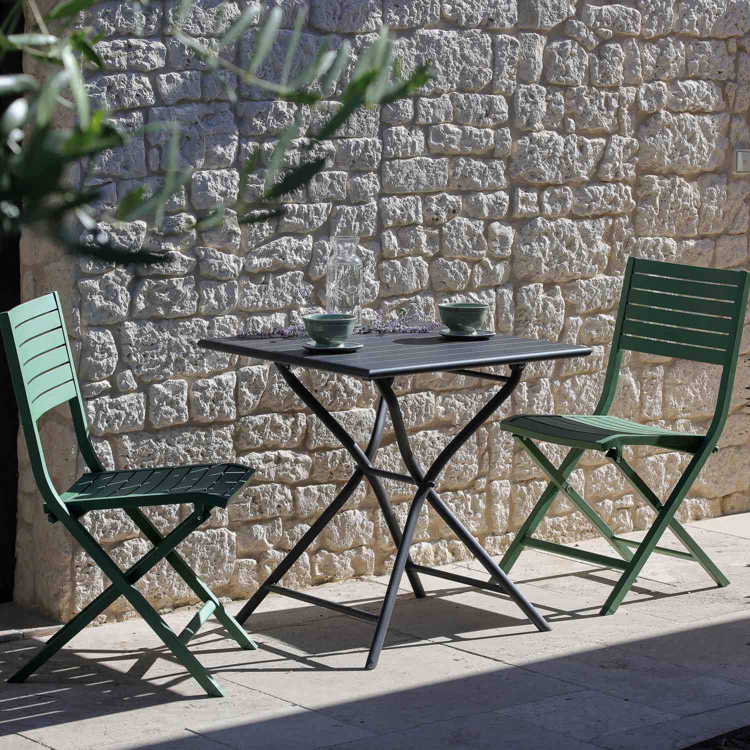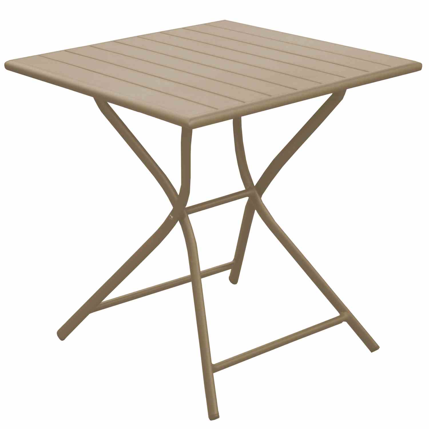 Caractéristiques techniques : table carrée en aluminium. Plateau à lattes, piétement pliant.